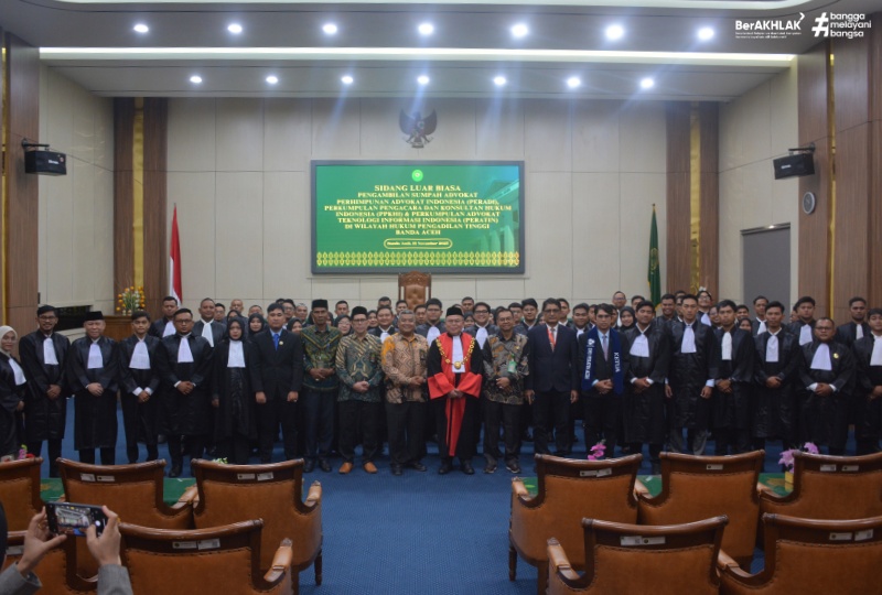 Banda Aceh, 13/11/2025. Pengadilan Tinggi Banda Aceh menyelenggarakan Sidang Luar Biasa Pengambilan Sumpah Advokat dari tiga organisasi profesi, yaitu Perhimpunan Advokat Indonesia (PERADI), Perkumpulan Pengacara dan Konsultan Hukum Indonesia (PPKHI), dan Perkumpulan Advokat Teknologi Informasi Indonesia (PERATIN) pada hari Kamis tanggal 13 November 2025.