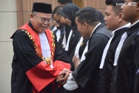 Kegaitan berlangsung khidmat di ruang sidang utama Pengadilan Tinggi Banda Aceh dan dipimpin langsung oleh Ketua Pengadilan Tinggi Banda Aceh, Bapak Nursyam, S.H., M.Hum., yang dalam kesempatan tersebut mengambil sumpah sebanyak 70 orang advokat baru.