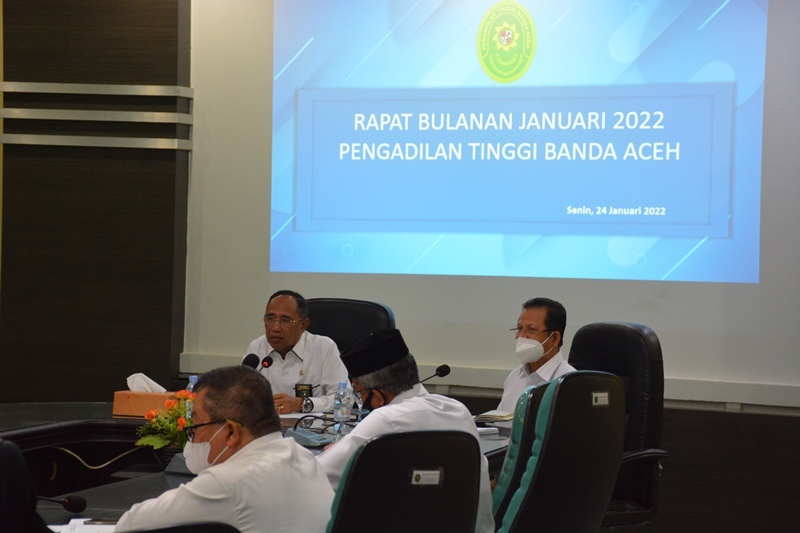 Banda Aceh - (24/1/2022) Dipimpin langsung oleh KPT Banda Aceh Aceh Dr. H. Gusrizal, S.H., M.Hum., Rapat bulanan PT Banda Aceh dihadiri oleh WKPT Banda Aceh H. Ahmad Shalihin, S.H., M.H., Para Hakim Tinggi, Panitera, Sekretaris, Pejabat Struktural, Pejabat Fungsinal dan seluruh Staf Pengadilan Tinggi Banda Aceh.