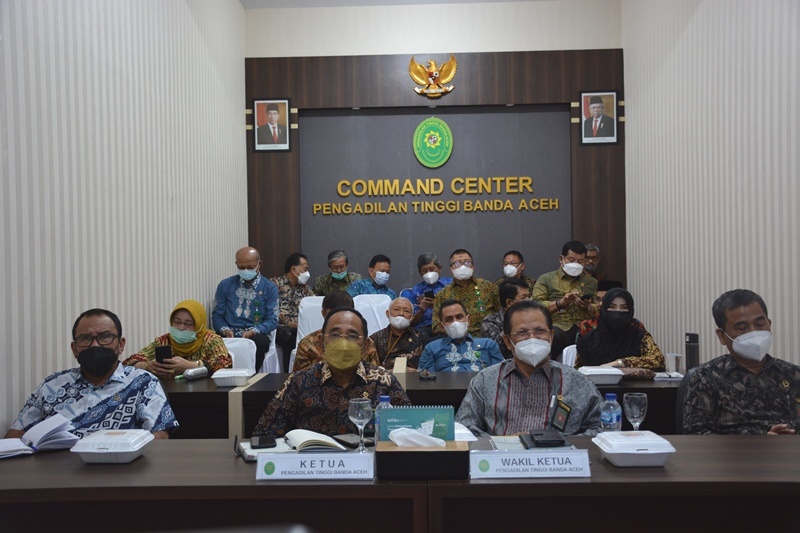 Banda Aceh - (27/1/2022) Pengadilan Tinggi Banda Aceh mengikuti Pembinaan Bidang Teknis dan Administrasi Yudisial oleh Pimpinan Mahkamah Agung RI secara virtual di ruang Command Center Pengadilan Tinggi Banda Aceh via zoom meeting. Kegiatan tersebut diselenggarakan di Hotel Best Westeren Premier Panbil Batam. Peserta dalam kegiatan tersebut yakni Ketua dan Wakil Ketua Pengadilan, seluruh Hakim, Panitera dan Sekretaris Pengadilan. Untuk Pengadilan Tinggi Banda Aceh dihadiri oleh Ketua Pengadilan Tinggi Banda Aceh Dr. H. Gusrizal, S.H., M.Hum., Wakil Ketua Pengadilan Tinggi Banda Aceh H. Ahmad Shalihin, para Hakim Tinggi dan Hakim Ad Hoc, Panitera serta Sekretaris Pengadilan Tinggi Banda Aceh.