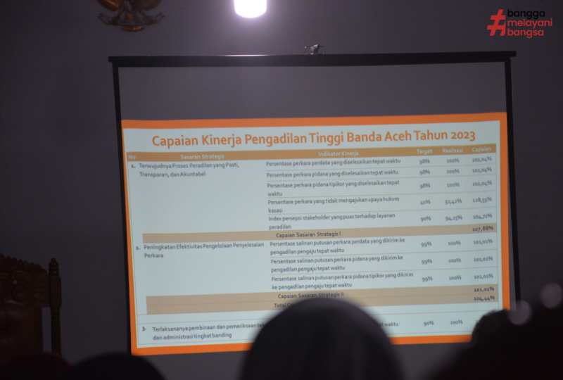 Dijelaskan bahwa pada tahun 2023 total capaian strategis PT Banda Aceh yaitu 104,44% dan capaian kinerja tambahan sebesar 111,11%. "Pada tahun 2023 Pengadilan Tinggi Banda Aceh berhasil meningkatkan capaian strategis sebesar 104,44% dari tahun 2022 dengan capaian 99,73%," terang ramdhani.