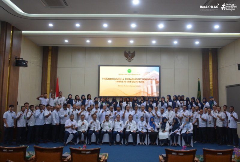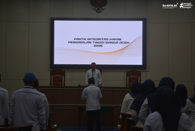 Banda Aceh, 5/1/2026. Mengawali kalender kerja tahun 2026, Pengadilan Tinggi Banda Aceh menggelar rangkaian kegiatan yang dipusatkan di ruang sidang utama pada Senin tanggal 5 Januari 2026. Kegiatan ini meliputi pembacaan serta penandatanganan Pakta Integritas dan penandatanganan Komitmen Bersama. Acara dipimpin langsung oleh Ketua Pengadilan Tinggi Banda Aceh Nursyam, S.H., M.Hum., dan dihadiri oleh para Hakim Tinggi, Hakim Ad Hoc, pejabat Kepaniteraan, Kesekretariatan, hingga seluruh staf di lingkungan Pengadilan Tinggi Banda Aceh.