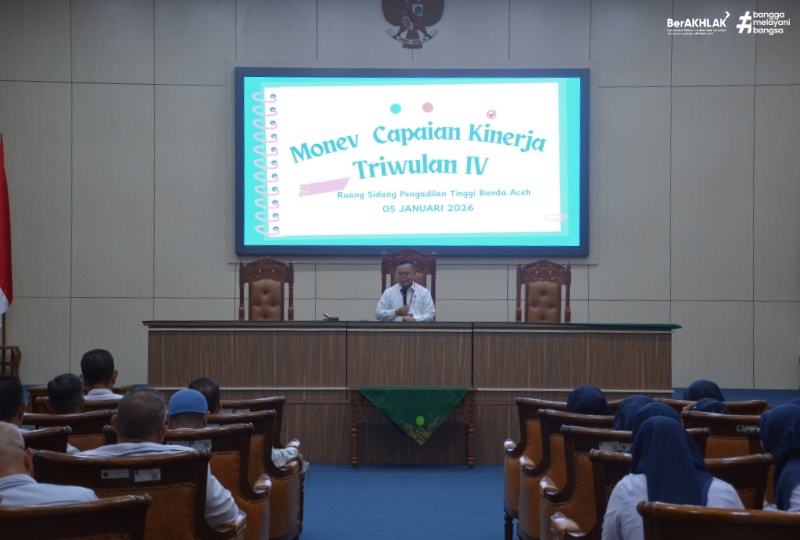 Banda Aceh, 5/1/2026. Pengadilan Tinggi Banda Aceh melaksanakan rapat Monitoring dan Evaluasi (Monev) Capaian Kinerja Triwulan IV Tahun 2025 sebagai bentuk transparansi dan akuntabilitas publik. Dalam laporan yang dipaparkan, instansi ini menunjukkan performa penanganan perkara yang sangat positif sepanjang tahun 2025. Tercatat pada perkara perdata, dari total 113 perkara yang ditangani , sebanyak 107 perkara berhasil diputus, menyisakan hanya 6 perkara di akhir tahun. Sementara itu, untuk perkara pidana, Pengadilan Tinggi berhasil memutus 612 perkara dari 639 perkara yang menjadi beban tahun 2025, dengan sisa akhir sebanyak 27 perkara.