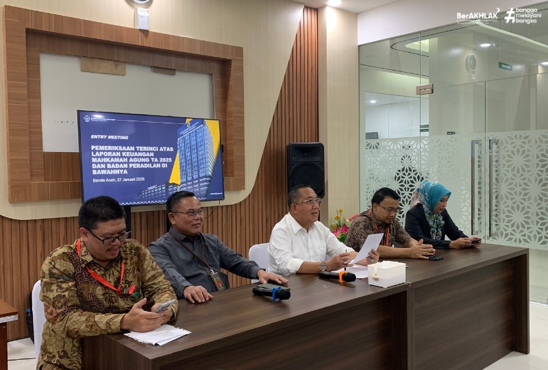 Banda Aceh, 27/1/2026 - Badan Pemeriksa Keuangan Republik Indonesia (BPK RI) resmi memulai rangkaian Pemeriksaan Terinci atas Laporan Keuangan Mahkamah Agung Tahun Anggaran 2025 serta Badan Peradilan di bawahnya. Kegiatan ini diawali dengan pelaksanaan Entry Meeting yang berlangsung di Pengadilan Tinggi Banda Aceh pada Selasa tanggal 27 Januari 2026. Pertemuan ini menjadi langkah awal strategis dalam memastikan pengelolaan dan tanggung jawab keuangan negara di lingkungan peradilan dilakukan secara transparan dan akuntabel sesuai amanat UUD 1945. Kegiatan dihadiri oleh Ketua Pengadilan Tinggi Banda Aceh Nursyam, S.H., M.Hum, Wakil Ketua Pengadilan Tinggi Banda Aceh A Bondan, S.H., M.H, Sekretaris Pengadilan Tinggi Banda Aceh Rismayati, S.T., M.M serta para PPK dari beberapa satuan kerja Mahkamha Syariah Aceh, Pengadilan Negeri Banda Aceh dan Pengadilan Tata Usaha Negara Banda Aceh.