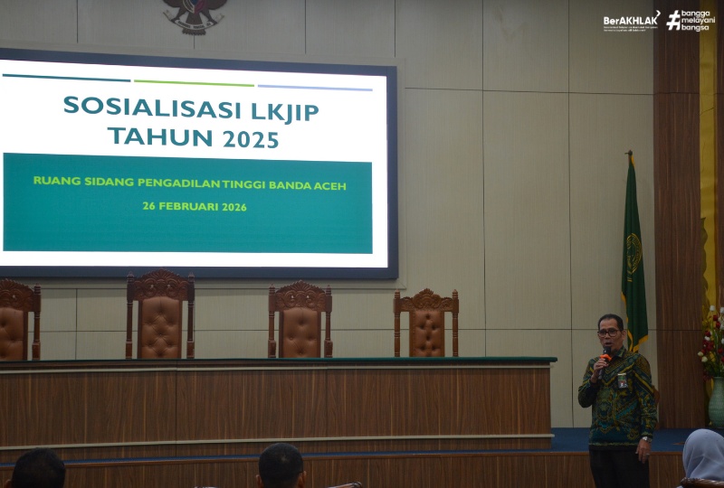 Banda Aceh, 26/2/2026 - Panitera Pengadilan Tinggi Banda Aceh, Drs. Efendi, S.H., menyampaikan paparan dalam kegiatan Sosialisasi Laporan Kinerja Instansi Pemerintah (LKjIP) Tahun 2025 yang diselenggarakan pada 26 Februari 2026 di Ruang Sidang Pengadilan Tinggi Banda Aceh. Dalam arahannya, penyelenggaraan tugas pokok dan fungsi (tupoksi) baik di bidang Kepaniteraan maupun Kesekretariatan telah berjalan dengan sangat baik, yang dibuktikan dengan penyelesaian perkara sesuai jangka waktu yang ditetapkan serta implementasi digitalisasi peradilan yang efektif. Beliau menegaskan bahwa pencapaian ini merupakan wujud nyata komitmen Pengadilan Tinggi Banda Aceh dalam menerapkan Sistem Akuntabilitas Kinerja Instansi Pemerintah (SAKIP) secara konsisten.