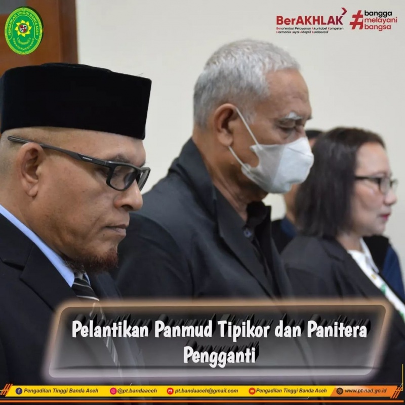 Banda Aceh - (07-12-2022) Pengadilan Tinggi Banda Aceh melaksanakan pelantikan bagi Panitera Muda Tindak Pidana Korupsi dan Panitera Pengganti Pengadilan Tinggi Banda Aceh, ketiganya dilantik langsung oleh Ketua Pengadilan Tinggi Banda Aceh dan disaksikan oleh pejabat Fungsional Dan Struktural Pengadilan Tinggi Banda Aceh, ketiga pejabat yang dilantik adalah :