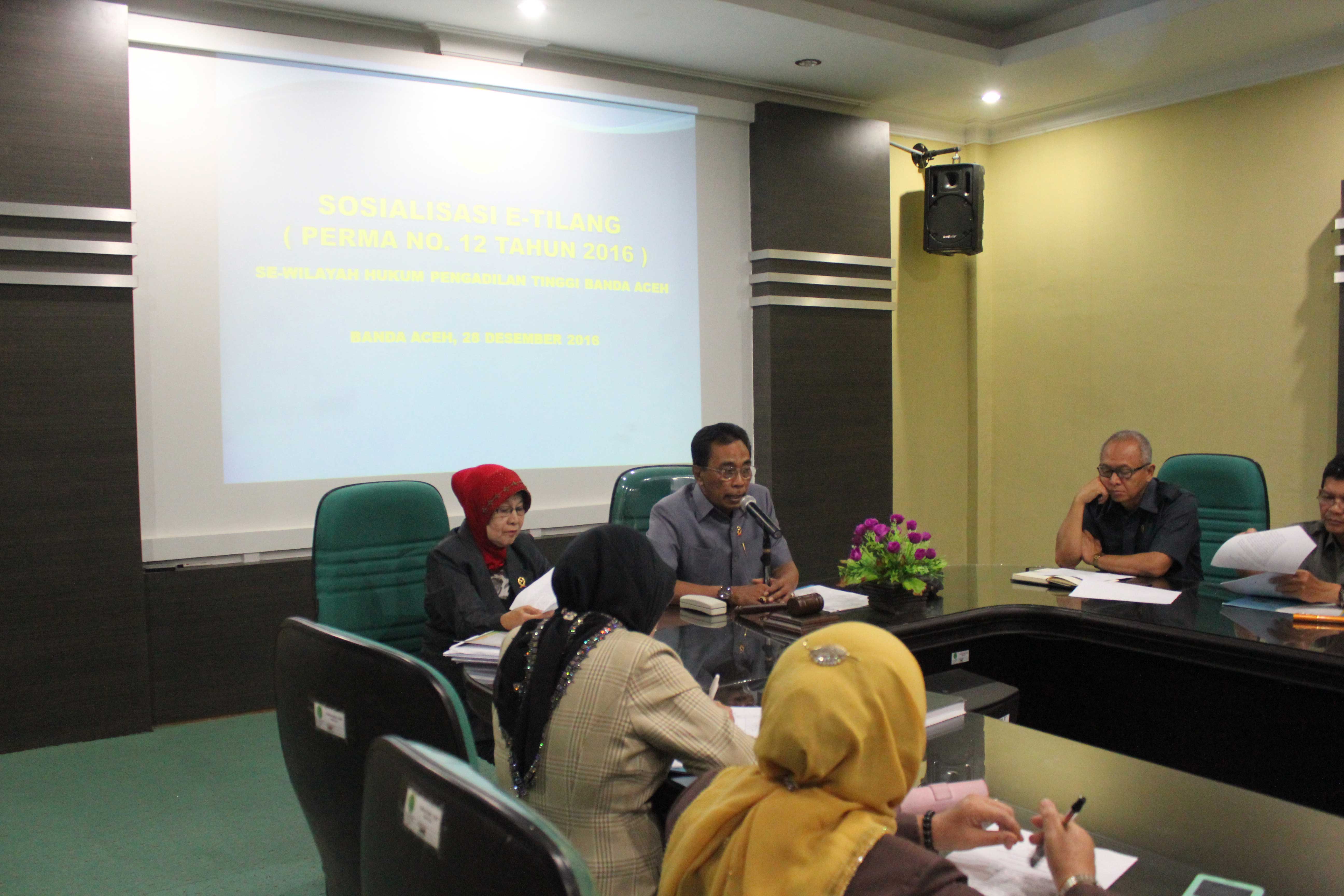 Bertempat di Ruang Rapat Lantai 2 Pengadilan Tinggi/Tipikor Banda Aceh, secara resmi Ketua Pengadilan Tinggi/Tipikor Banda Aceh H. CHAIDIR, SH, MH membuka acara kegiatan Sosialisasi E-Tilang ( PERMA No. 12 Tahun 2016 ). Dalam kesempatan ini Wakil Ketua Pengadilan Tinggi/Tipikor Banda Aceh Hj. NURLELA KATUN, SH, MH  memberikan pemaparan dan pembahasan dari PERMA No. 12 Tahun 2016 tentang Tata Cara Penyelesaian Perkara Pelanggaran Lalu Lintas yang mana PERMA ini adalah sebagai acuan dalam penerapan aplikasi E-Tilang di masing-masing Pengadilan Tingkat Pertama.