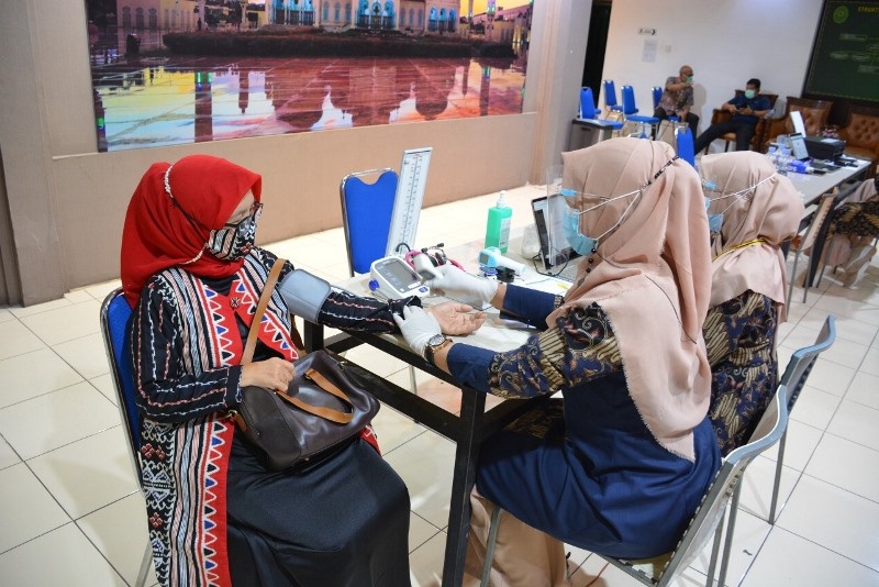 sebelum dilakukan penyuntikan vaksin, para petugas medis yang bertugas untuk memberikan vaksin memeriksa terlebih dahulu kondisi fisik/kesehatan dari calon penerima vaksin, apabila setelah pemeriksaan calon penerima vaksin menunjukkan hasil fisik/kesehatan yang baik maka penyuntikan vaksin dapat dilakukan.