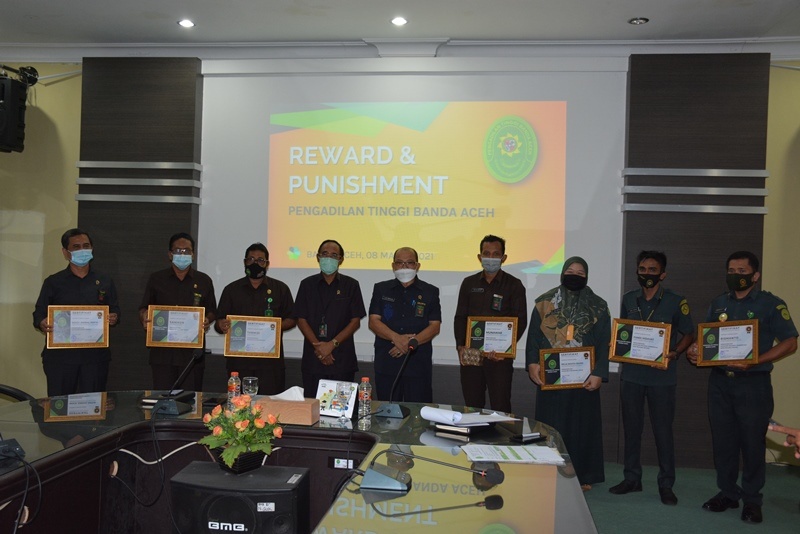 Banda Aceh - Pengadilan Tinggi Banda Aceh memberikan reward kepada pegawai teladan di lingkungan Pengadilan Tinggi Banda Aceh, pemberian reward dilakukan di ruang rapat lantai dua Pengadilan Tinggi Banda Aceh. Selain pemberian Reward kepada pegawai teladan, Pengadilan Tinggi Banda Aceh juga memberikan Punishment kepada pegawai yang kinerjanya dinilai perlu untuk di tingkatkan lagi.