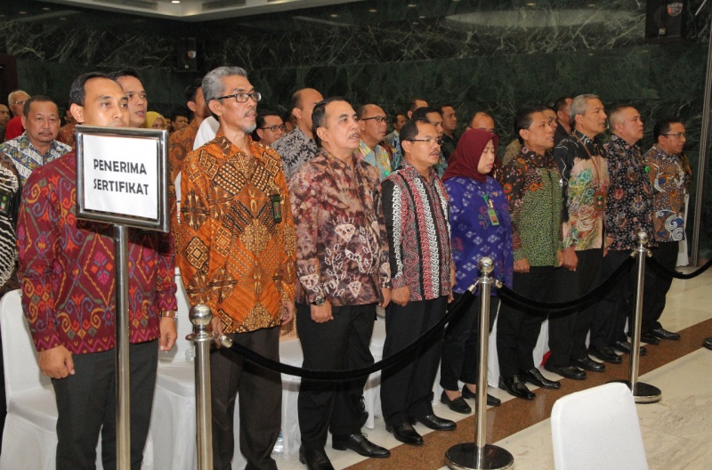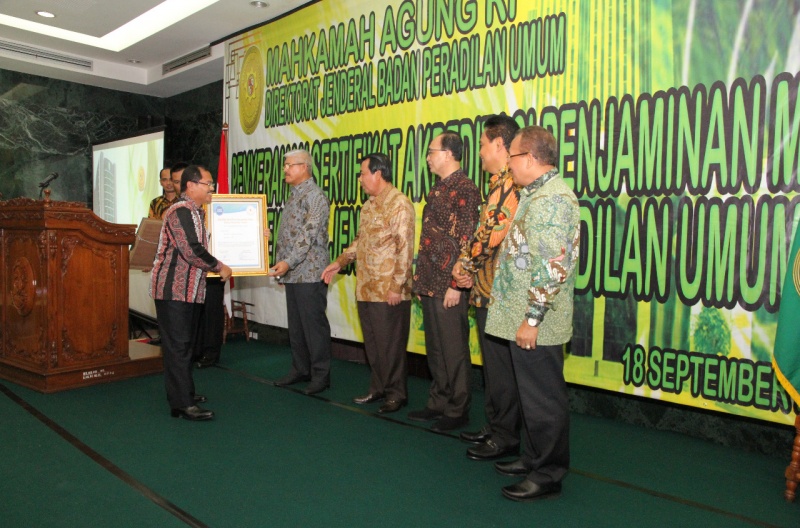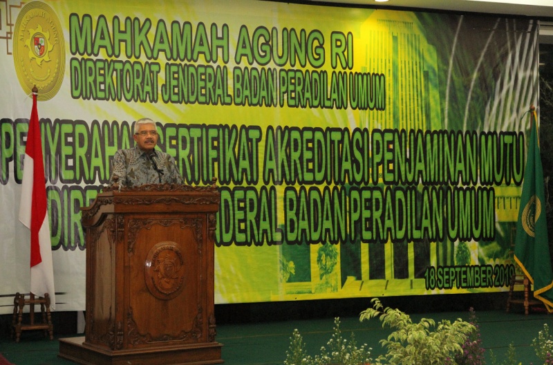 Ketua Mahkamah Agung, Prof. Dr. M. Hatta Ali, S.H., M.H. didampingi oleh Wakil Ketua Mahkamah Agung Bidang Yudisial dan Non Yudisial, Direktur Jenderal Badan Peradilan Umum, dan Sekretaris Mahkamah Agung menyerahkan sertifikat Akreditasi Penjaminan Mutu kepada 26 Pengadilan Negeri, pada hari Rabu, 18/9/2019, bertempat di gedung Sekretariat Mahkamah Agung, Jalan Ahmad Yani, Jakarta.