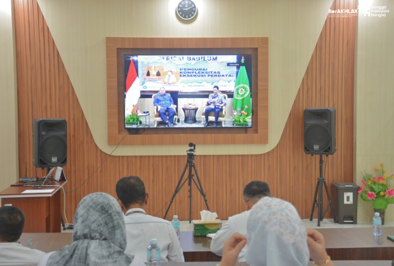 Banda Aceh, 6/10/2025. Direktorat Jenderal Badan Peradilan Umum (Badilum) Mahkamah Agung RI kembali menggelar kegiatan rutin pembinaan dan diskusi interaktif, Perisai (Pertemuan Rutin Sarasehan Interaktif) Episode ke-10, pada hari Senin tanggal 6 Oktober 2025. Mengusung tema krusial, “Mengurai Kompleksitas Eksekusi Perdata: Problematika, Solusi, dan Prospek Pembaruan Hukum”, kegiatan ini dilaksanakan secara daring dan diikuti oleh seluruh jajaran Pengadilan Tinggi dan Pengadilan Negeri di seluruh Indonesia, mulai pukul 08.30 hingga 12.00 WIB. Dari Pengadilan Tinggi Banda Aceh, kegiatan tersebut dihadiri langsung oleh Ketua Pengadilan Tinggi Banda Aceh, Bapak Nursyam, S.H., M.Hum., beserta jajaran Hakim Tinggi, Hakim Ad Hoc, Panitera, serta para Panitera Muda.