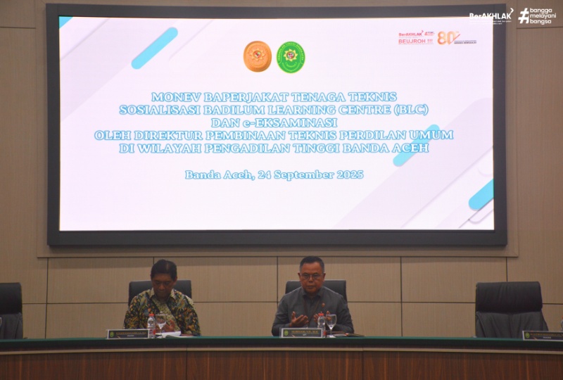Banda Aceh, 24/9/2025. Pengadilan Tinggi Banda Aceh menyelenggarakan kegiatan Monitoring dan Evaluasi (Monev) Baperjakat Tenaga Teknis, Sosialisasi Badilum Learning Centre (BLC), dan e-Eksaminasi yang dipimpin langsung oleh Tim Badilum pada Rabu tanggal 24 September 2025. Kegiatan ini berlangsung di ruang utama Pengadilan Tinggi Banda Aceh dan dihadiri oleh Ketua Pengadilan Tinggi Banda Aceh, Bapak Nursyam, S.H., M.Hum, para Hakim Tinggi, Hakim Ad Hoc, pejabat kepaniteraan, kesekretariatan, serta seluruh staf Pengadilan Tinggi Banda Aceh.