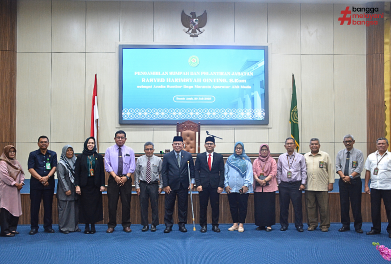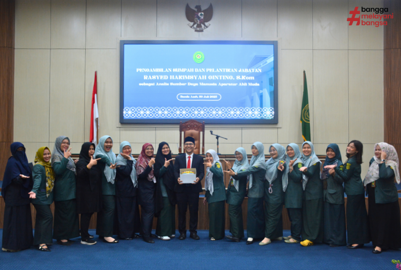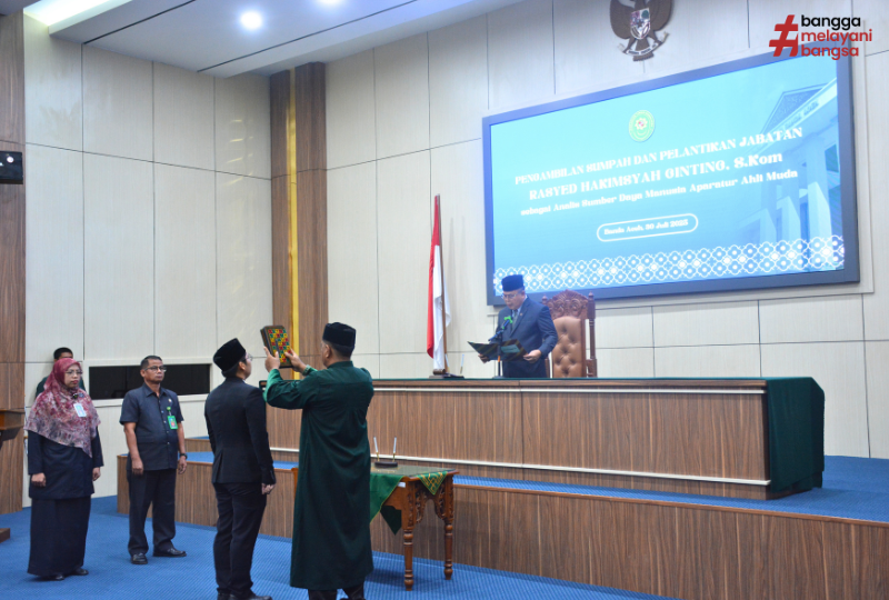 Banda Aceh, 30/7/2025. Dalam rangka penguatan tata kelola kepegawaian dan mendukung pelaksanaan tugas-tugas administrasi kepegawaian yang lebih profesional, Pengadilan Tinggi Banda Aceh melaksanakan kegiatan Pelantikan dan Pengambilan Sumpah Jabatan Fungsional Analis Sumber Daya Manusia Aparatur Ahli Muda pada hari Rabu tanggal 30 Juli 2025. Acara berlangsung khidmat di Ruang Sidang Kantor Pengadilan Tinggi Banda Aceh pada pukul 09.30 WIB.