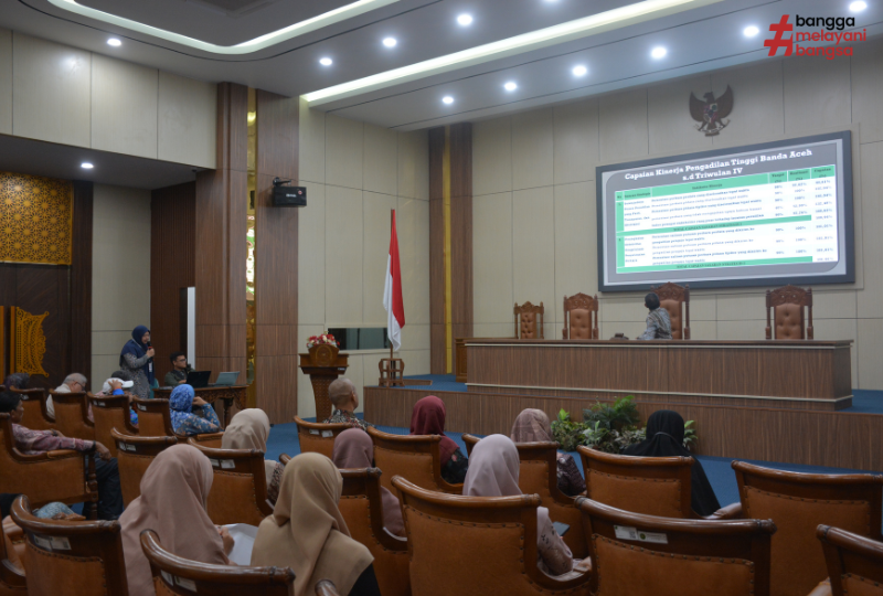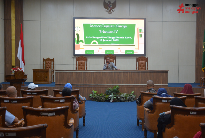 Banda Aceh, 10/01/2025. Pengadilan Tinggi Banda Aceh melaksanakan kegiatan monitoring dan evaluasi capaian kinerja triwulan IV pada Jumat tanggal 10 Januari 2025. Acara yang berlangsung di ruang sidang utama ini dipimpin oleh Kasubbag Rencana Program dan Anggaran, Relia Novita Rahim, S.E., M.B.A. Kegiatan tersebut dihadiri oleh para hakim tinggi, hakim ad hoc, pejabat kepaniteraan dan kesekretariatan, serta seluruh staf pengadilan. Monitoring ini bertujuan untuk meninjau pencapaian target kinerja tahun 2024 dan menyusun strategi perbaikan untuk tahun 2025.