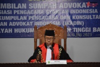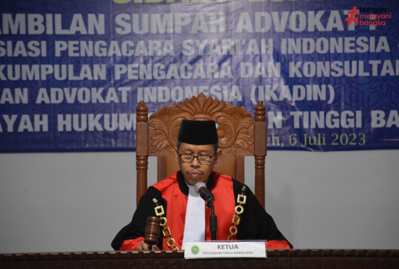 Banda Aceh, 6/7/2023 (Humas) - Ketua Pengadilan Tinggi Banda Aceh (KPT BNA) Dr. H. Suharjono, S.H., M.Hum. mengambil sumpah advokat pada hari Kamis, 6 Juli 2023 bertempat di ruang sidang gedung sementara Pengadilan Tinggin Banda Aceh. Sebanyak 27 orang advokat yang berasal dari berbagai organisasi profesi advokat yaitu IKADIN (Ikatan Advokat Indonesia) sebanyak 15 orang, PPKHI (Perkumpulan Pengacara dan Konsultan Hukum Indonesia) sebanyak 6 orang dan APSI (Asosiasi Pengacara Syari'ah Indonesia) sebanyak 6 orang.