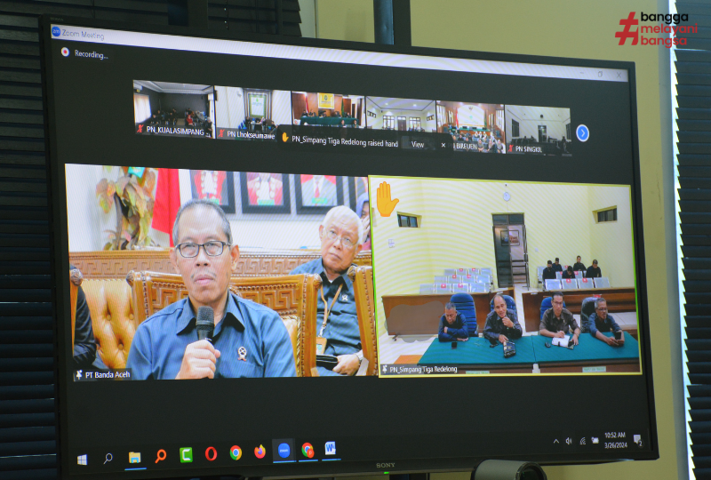 Banda Aceh, 26/3/2024 (Humas) - Pengadilan Tinggi Banda Aceh lakukan Pembinaan dan Pengawasan pada Pengadilan Negeri se-Wilayah Hukum PT Banda Aceh secara daring via zoom meeting. Pembinaan yang dilaksanakan pada hari Selasa tanggal 26 Maret 2024 tersebut dihadiri oleh KPT Banda Aceh Dr. H. Suharjono, S.H., M.Hum. Wakil Ketua Pengadilan Tinggi Banda Aceh Isnurul Syamsul Arif, S.H., M.Hum. Hakim Tinggi Pengawas Daerah, Hakim Ad Hoc Pengawas Daerah Panitera, Sekretaris, Pejabat Struktural dan seluruh Pengadilan Negeri.