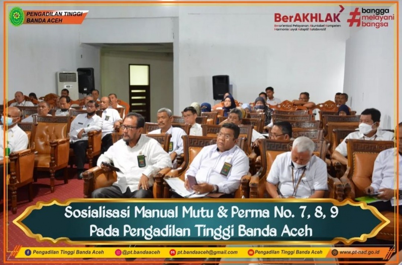 Banda Aceh - 17/10/2022 Pengadilan Tinggi Banda Aceh melaksanakan Sosialisasi di Ruang Sidang Kantor sementara Pengadilan Tinggi Banda Aceh, Sosialisasi tersebut disampaikan oleh Ketua Pengadilan Tinggi Banda Aceh dan diikuti oleh seluruh Hakim Tinggi, Pejabat Struktural Fungsional serta Aparatur Pengadilan Tinggi lainnya.