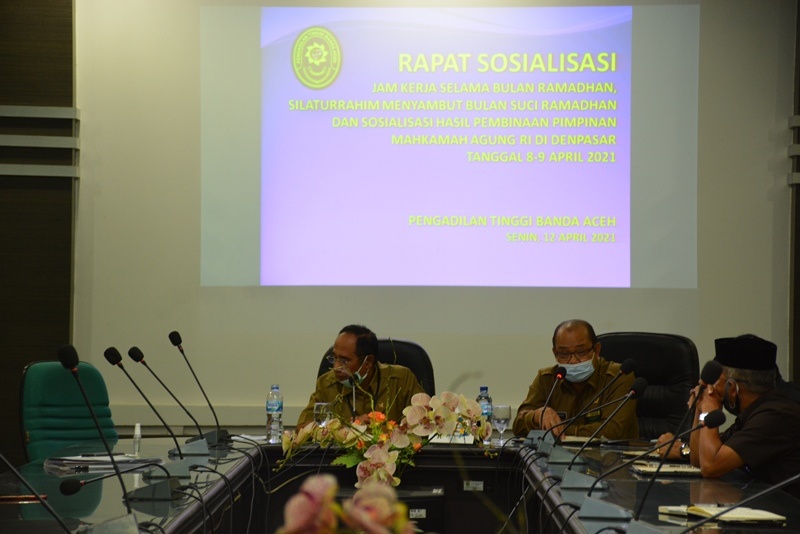 Banda Aceh - Bertempat di Ruang Rapat Lantai II Pengadilan Tinggi Banda Aceh, di laksanakan "RAPAT SOSIALISASI JAM KERJA SELAMA BULAN RAMADHAN, SILATURRAHIM MENYAMBUT BULAN SUCI RAMADHAN DAN SOSIALISASI HASIL PEMBINAAN PIMPINAN MAHKAMAH AGUNG RI DI DENPASAR TANGGAL 8-9 APRIL 2021". Rapat dipimpin langsung oleh Ketua Pengadilan Tinggi Banda Aceh Dr. H. Gusrizal, S.H., M.Hum. serta turut dihadiri oleh Wakil Ketua Pengadilan Tinggi Banda Aceh H. Ade Komarudin, S.H., M.Hum., Para Hakim Tinggi, Hakim Ad Hoc, Pejabat Kesekretariatan, Pejabat Kepanitera, dan seluruh Staf Pengadilan Tinggi Banda Aceh.