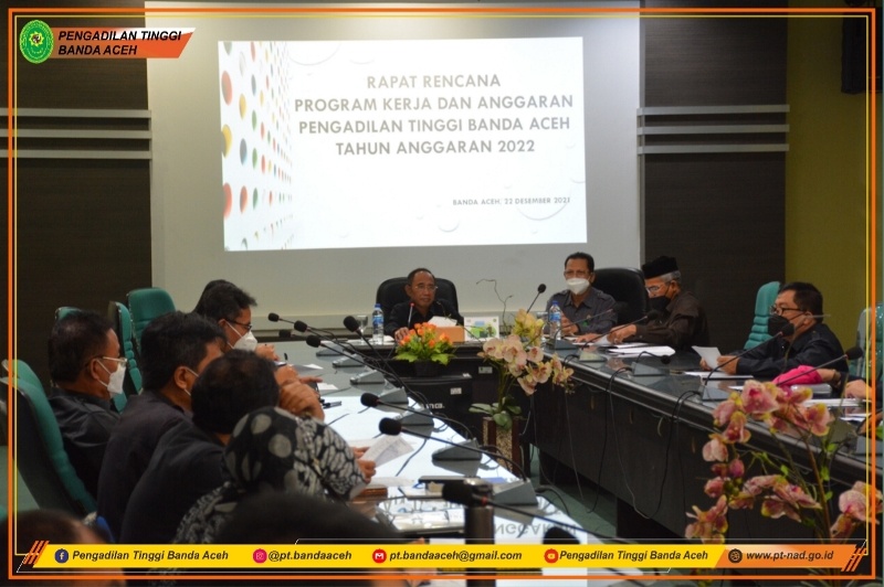 Banda Aceh - (22/12/2021) Bertempat di Ruang Rapat lantai 2 Pengadilan Tinggi Banda Aceh, dilaksanakan "RAPAT RENCANA PROGRAM KERJA DAN ANGGARAN PENGADILAN TINGGI BANDA ACEH TAHUN ANGGARAN 2022" yang dipimpin oleh Ketua Pengadilan Tinggi Banda Aceh Dr. H. Gusrizal, S.H., M.Hum. turut di hadiri pula oleh Wakil Ketua Pengadilan Tinggi Banda Aceh H. Ahmad Shalihin, S.H., M.H., Panitera, Sekretaris, Panitera Muda, Pejabat Struktural, Pejabat Fungsional, dan Staf Pengadilan Tinggi Banda Aceh.