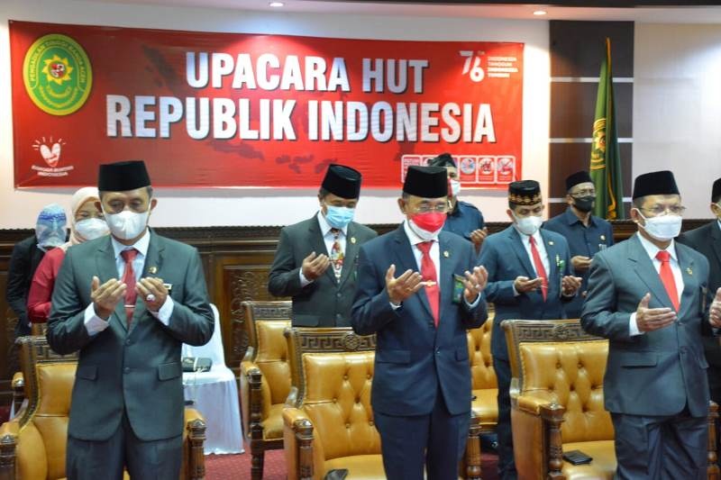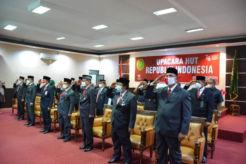 Banda Aceh - (17/8/2021), Bertempat di ruang sidang Pengadilan Tinggi Banda Aceh, Ketua Pengadilan Tinggi Banda Aceh, Wakil Ketua Pengadilan Tinggi Banda Aceh, beserta Panitera, Sekretaris, beberapa hakim tinggi, pejabat kepaniteraan, pejabat kesekretariatan, serta beberapa staf Pengadilan Tinggi Banda Aceh mengikuti Upacara Peringatan HUT ke-76 Kemerdekaan RI secara virtual.