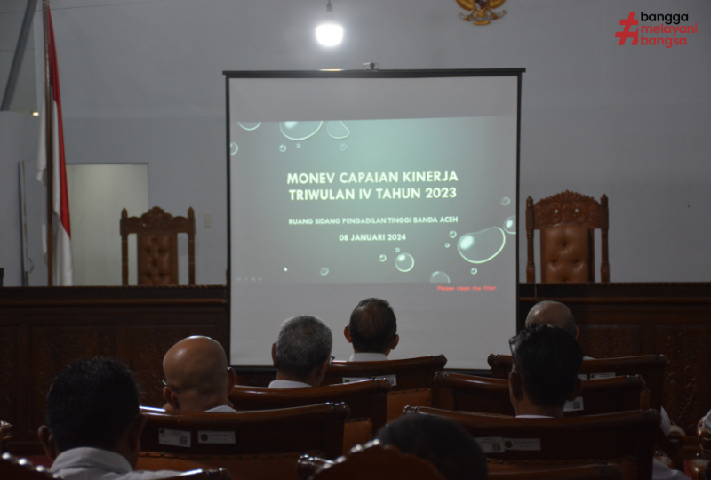 Banda Aceh, 08/01/2024 (Humas) - Bertempat di ruang sidang Pengadilan Tinggi Banda Aceh melaksanakan rapat Monitoring dan Evaluasi Capaian Akuntabilitas Kinerja Triwulan IV Tahun Anggaran 2023, rapat Penyusunan SAKIP 2024 (LKjIP 2023), dan rapat Penyusunan Laporan Pelaksanaan Kegiatan Tahun 2023 Pengadilan Tinggi Banda Aceh pada hari Senin tanggal 8 Januari 2024 dan dihadiri oleh seluruh Hakim dan Aparatur PT Banda Aceh.