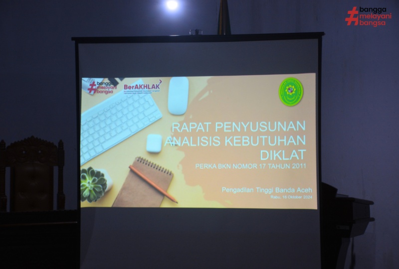 Banda Aceh, 17/10/2024. Pengadilan Tinggi Banda Aceh mengadakan rapat penyusunan analisis kebutuhan diklat sesuai dengan Peraturan Kepala Badan Kepegawaian Negara (PERKA BKN) Nomor 17 Tahun 2011 pada hari Kamis tanggal 17 Oktober 2024. Acara ini dilaksanakan di ruang sidang Pengadilan Tinggi Banda Aceh dan disampaikan oleh Kasubbag Kepegawaian dan Teknologi Informasi, Putri Armanusah, S.T. Rapat tersebut dihadiri oleh Wakil Ketua Pengadilan Tinggi Banda Aceh, Isnurul Syamsul Arif, S.H., M.Hum, para hakim tinggi, pejabat kepaniteraan kesekretariatan, serta staf pengadilan.