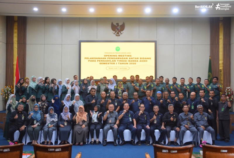 Banda Aceh, 7/4/2026 - Upaya memperkuat komitmennya dalam menjaga integritas dan profesionalisme, Pengadilan Tinggi Banda Aceh menyelenggarakan Opening Meeting Pengawasan Antar Bidang Tahun 2026 pada Selasa tanggal 7 April 2026. Bertempat di Ruang Sidang Utama, kegiatan ini menjadi langkah strategis lembaga dalam mengoptimalkan fungsi kontrol internal. Fokus utama dari pertemuan ini adalah memastikan bahwa setiap lini organisasi, baik di bagian teknis kepaniteraan maupun kesekretariatan, menjalankan tugas pokok dan fungsinya secara transparan dan sesuai dengan standar operasional yang berlaku. Kegiatan Pengawasan Antar Bidang diagendakan berlangsung selama 2 hari, mulai 7 sampai 8 April 2026.