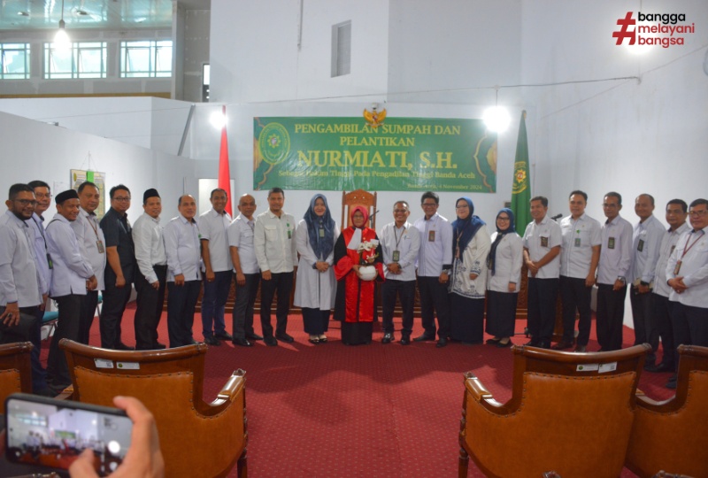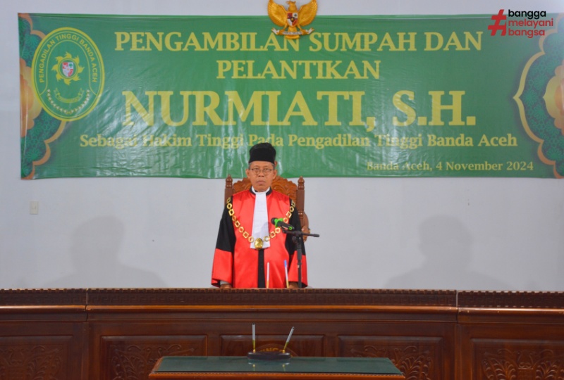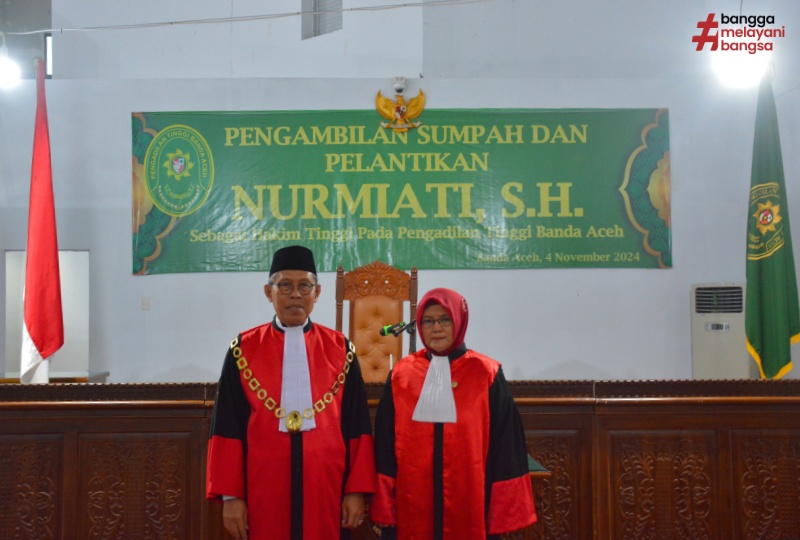 Banda Aceh, 4/11/2024. Pengadilan Tinggi Banda Aceh menggelar acara pengambilan sumpah dan pelantikan Hakim Tinggi baru, Nurmiati, S.H., yang sebelumnya menjabat sebagai hakim di Pengadilan Negeri Medan. Acara pelantikan ini berlangsung di ruang sidang Pengadilan Tinggi Banda Aceh pada Senin tanggal 4 November 2024, dengan dihadiri oleh sejumlah pejabat tinggi serta seluruh staf pengadilan. Prosesi pengambilan sumpah dipimpin langsung oleh Ketua Pengadilan Tinggi Banda Aceh, Dr. H. Suharjono, S.H., M.Hum., yang secara khidmat melantik Nurmiati, S.H. sebagai bagian dari jajaran hakim tinggi di Aceh.