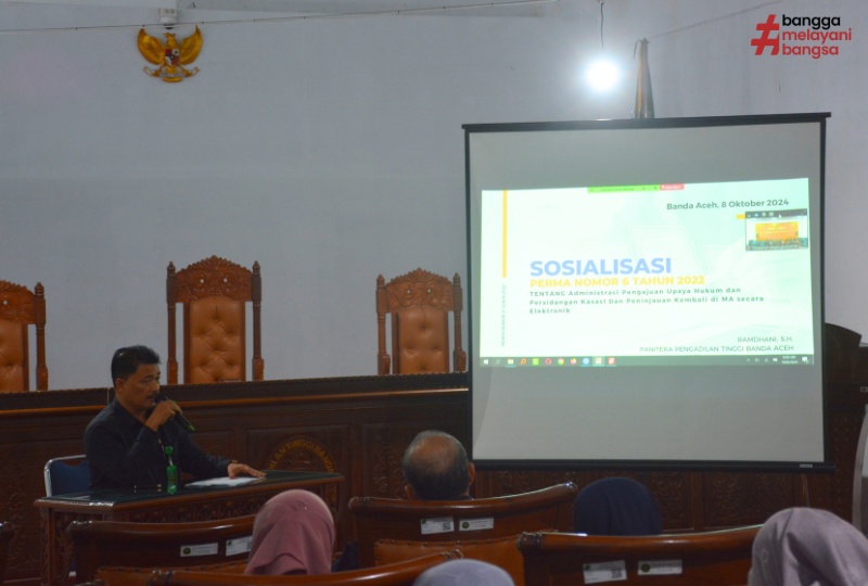 Banda Aceh, 8/10/2024. Pengadilan Tinggi Banda Aceh melaksanakan kegiatan sosialisasi Peraturan Mahkamah Agung (Perma) Nomor 6, 7, dan 8 Tahun 2022 pada hari Selasa tanggal 8 Oktober 2024, bertempat di Ruang Sidang Pengadilan Tinggi Banda Aceh. Acara ini dipimpin oleh Panitera Pengadilan Tinggi Banda Aceh, Ramadhani, S.H., yang memaparkan isi dan implementasi dari ketiga Perma tersebut. Kegiatan ini dihadiri langsung oleh Wakil Ketua Pengadilan Tinggi Banda Aceh, Isnurul Syamsul Arif, S.H., M.Hum. serta para Hakim Tinggi, Hakim Ad Hoc, pejabat kepaniteraan dan kesekretariatan, dan seluruh staf pengadilan.