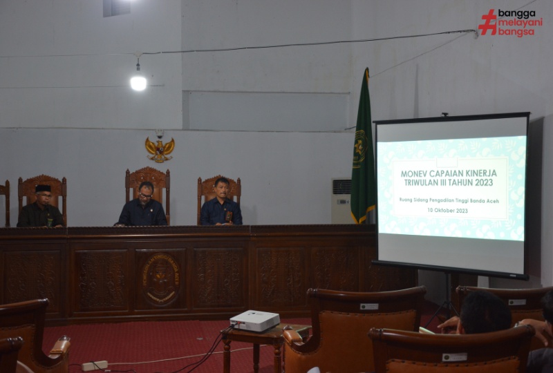 Banda Aceh, 10/10/2023 (Humas) - Pengadilan Tinggi Banda Aceh melaksanakan Rapat Monev Capaian Kinerja Triwulan III pada tanggal 10 Oktober 2023. Rapat yang berlangsung di ruang sidang gedung sementara Pengadilan Tinggi Banda Aceh dihadiri oleh Plh. Ketua Pengadilan Tinggi Banda Aceh Syamsul Qamar, S.H., M.H., para Hakim Tinggi, Hakim Ad Hoc, Panitera, Sekretaris, Pejabat Struktural dan Fungsional serta para Pegawai Pengadilan Tinggi Banda Aceh.