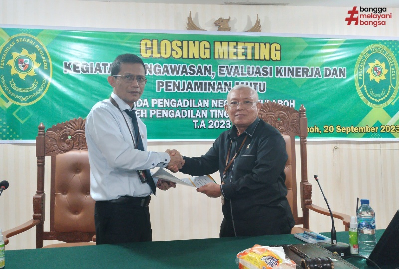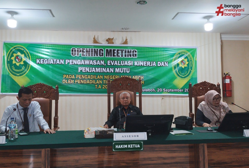Banda Aceh, 20/09/2023 (Humas) - Tim Evaluasi Kinerja Penjaminan Mutu Pengadilan Tinggi Banda Aceh yang diketuai oleh Dr. H. Supriadi, S.H., M.H. selaku Hakim Tinggi pada Pengadilan Tinggi Banda Aceh dengan didampingi Ainal Mardhiah, S.H., M.H. selaku Hakim Tinggi Pengawas Pengadilan Negeri Suka Makmue dan Laila Bahtra Husein, A.Md. selaku admin Tim Evaluasi Kinerja Penjaminan Mutu melakukan Evaluasi Kinerja pada Pengadilan Negeri Meulaboh yang dilaksanakan pada hari Rabu, 20 September 2023 bertempat di Pengadilan Negeri Meulaboh. Evaluasi Kinerja ini merupakan Evaluasi Kinerja Semester II yang dilakukan oleh Pengadilan Tinggi Banda Aceh terhadap Pengadilan Negeri Meulaboh. Terdapat beberapa temuan pada Pengadilan Negeri Meulaboh namun bukan merupakan temuan berat dan akan ditindaklanjuti selama 2 minggu setelah Laporan Hasil Evaluasi Kinerja diserahkan kepada Ketua Pengadilan Negeri Meulaboh.