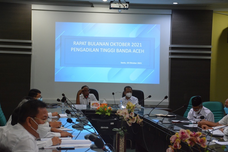 Banda Aceh - (18/10/2021) Rapat Bulanan Periode Oktober Pengadilan Tinggi Banda Aceh dilaksanakan di Ruang Rapat Lt. II gedung Pengadilan Tinggi Banda Aceh, rapat dipimpin oleh Ketua Pengadilan Tinggi Banda Aceh Dr. H. Gusrizal, S.H., M.Hum. kemudian dihadiri oleh Wakil Ketua Pengadilan Tinggi Banda Aceh, seluruh Hakim Tinggi, Hakim AD HOC, Pejabat Struktural dan Fungsional serta seluruh Pegawai/staf Pengadilan Tinggi Banda Aceh.