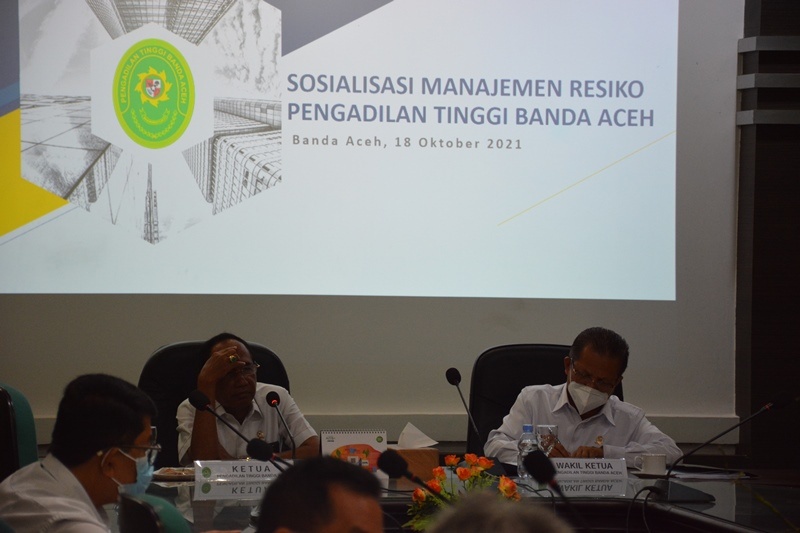 Banda Aceh - (18/10/2021) bertempat pada ruang rapat Lt. II Pengadilan Tinggi Banda Aceh, Ketua Pengadilan Tinggi Banda Aceh YM. Dr. H. Gusrizal S.H., M.Hum. menyampaikan sosialisasi manajemen resiko kepada seluruh warga Pengadilan Tinggi Banda Aceh. Dalam sosialisasi tersebut turut hadir juga Wakil Ketua Pengadilan Tinggi Banda Aceh YM. H. Ahmad Shalihin, S.H., M.H.