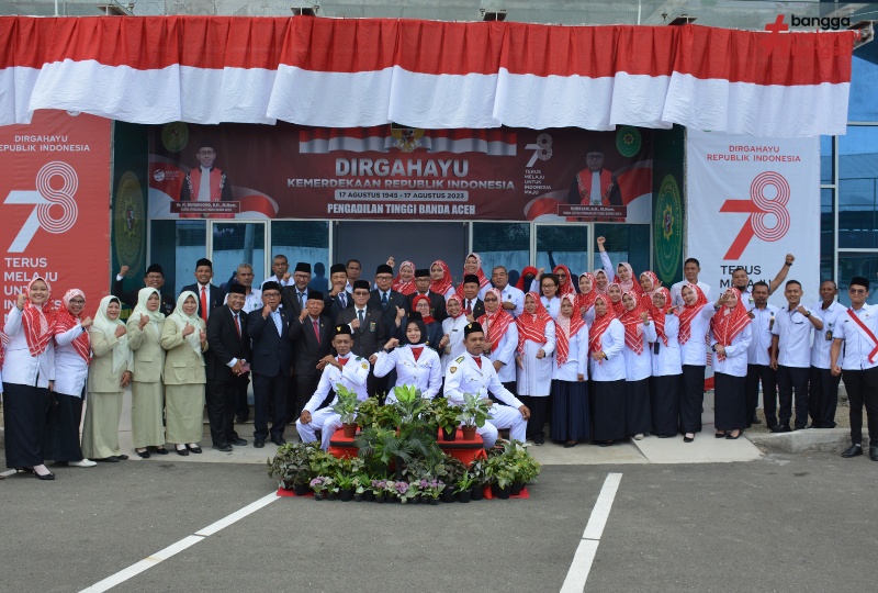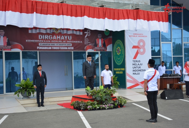 Banda Aceh 17/08/2023 (Humas), Bertempat di Halaman Kantor Sementara Pengadilan Tinggi Banda Aceh dilaksanakan Upacara Peringatan Dirgahayu Republik Indonesia Ke-78. Upacara dipimpin langsung oleh Wakil Ketua Pengadilan Tinggi Banda Aceh Bapak Nursyam, S.H.,M.Hum selaku Pembina Upacara dan Sigit Pramono Ginting, A.Md.T bertindak selaku Komandan Upacara. Upacara diikuti serta oleh Para Hakim Tinggi, Hakim Ad Hoc, Pejabat Kepaniteraan, Pejabat Kesekretariatan, Fungsional, Pelaksana dan para PPNPN. Kegiatan berjalan dengan tertip dan khidmat.