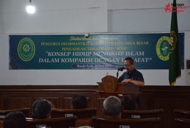 Banda Aceh, 20/06/2023 (Aceh) - Ketua Pengadilan Tinggi Banda Aceh Dr. Suharjono, S.H., M.Hum. menyampaikan ceramah agama pada hari Selasa 20 Juni 2023 bertempat di ruang sidang Pengadilan Tinggi Banda Aceh. Ceramah agama yang dilakukan secara daring dan luring itu mengambil tema "KONSEP HIDUP MENURUT ISLAM DALAM KOMPARASI DENGAN FILSAFAT" dengan peserta daring via zoom meeting diikuti oleh Pengadilan Negeri dan DYK Cabang se-wilayah hukum Pengadilan Tinggi Banda Aceh dan peserta luring dihadiri oleh seluruh warga PT Banda Aceh dan Pengurus Daerah DYK Aceh.