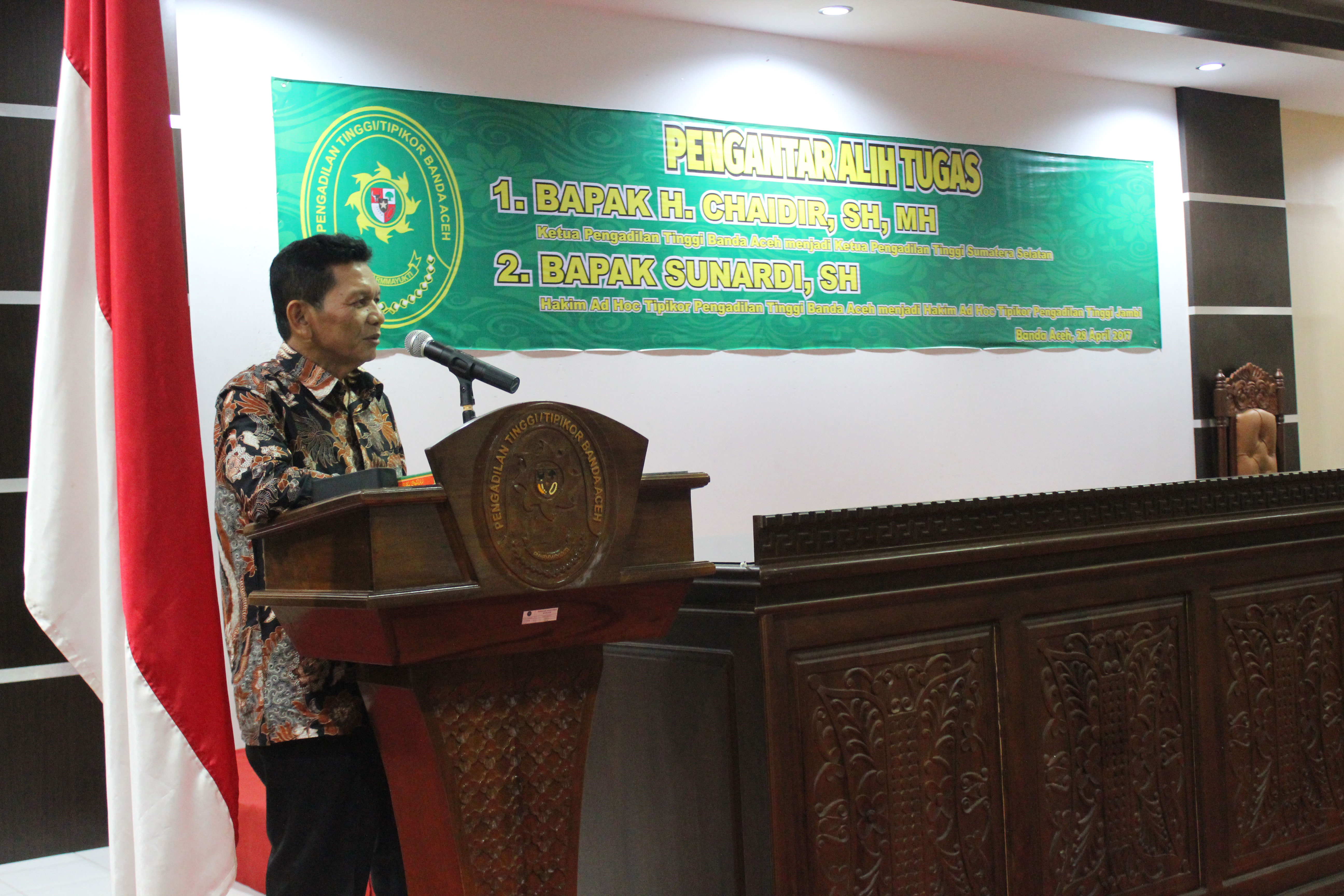 Pada kesempatan tersebut, Bapak H. CHAIDIR, S.H., M.H. yang telah bertugas selama ± 2 tahun 7 bulan sebagai Ketua Pengadilan Tinggi Banda Aceh menyampaikan kata-kata perpisahan dan pamit kepada seluruh tamu undangan yang hadir, dan mengharapkan dalam kepemimpinan Bapak H. DJUMALI, S.H., Pengadilan Tinggi Banda Aceh dapat lebih baik lagi.