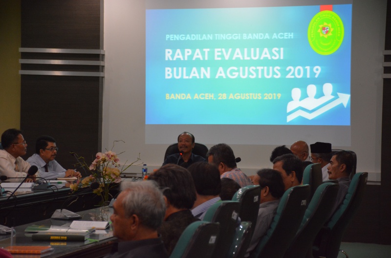Banda Aceh-ITPT: Pengadilan Tinggi Banda Aceh menyelenggarakan rapat Evaluasi Bulan Agustus Tahun 2019, bertempat di Ruang Rapat Pengadilan Tinggi Banda Aceh tanggal 28 Agustus 2019. Rapat ini dihadiri oleh Ketua Pengadilan Tinggi Banda Aceh, Wakil Ketua Pengadilan Tinggi Banda Aceh, para Hakim Tinggi, para Hakim Ad Hoc, Hakim Non Palu, para Pejabat Fungsional dan Struktural, serta para Pegawai Pengadilan Tinggi Banda Aceh.