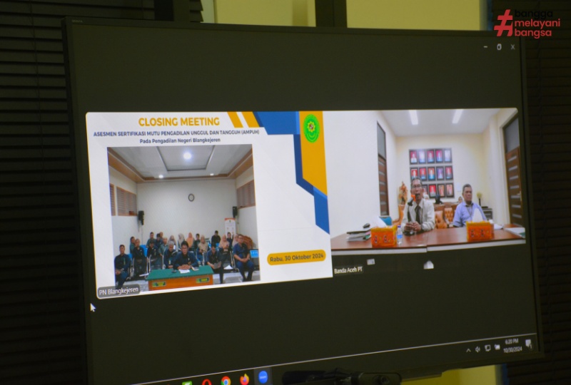 Banda Aceh, 30/10/2024. Pengawasan dan Asesmen Sertifikasi Mutu Peradilan Unggul dan Tangguh (AMPUH) di Pengadilan Negeri Blangkejeren berlangsung pada Rabu tanggal 30 Oktober 2024, melalui platform daring zoom meeting. Kegiatan yang diselenggarakan oleh Pengadilan Tinggi Banda Aceh ini merupakan bagian dari upaya mempertahankan standar mutu peradilan yang transparan dan berintegritas. Dengan program sertifikasi AMPUH, diharapkan Pengadilan Negeri Blangkejeren dapat memberikan pelayanan yang responsif, cepat, dan berkualitas bagi masyarakat, sejalan dengan standar mutu nasional.